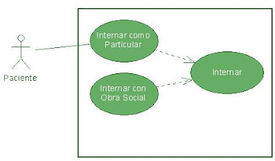 Podemos imaginarnos el siguiente diagrama de Casos de Uso. Si la descripcion del sistema dice que “los pacientes pueden internarse por obra social o de forma particular”, es casi evidente –intuitivo incluso- pensar en una especialización de un caso mas general denominado “Internar”. Algo así: